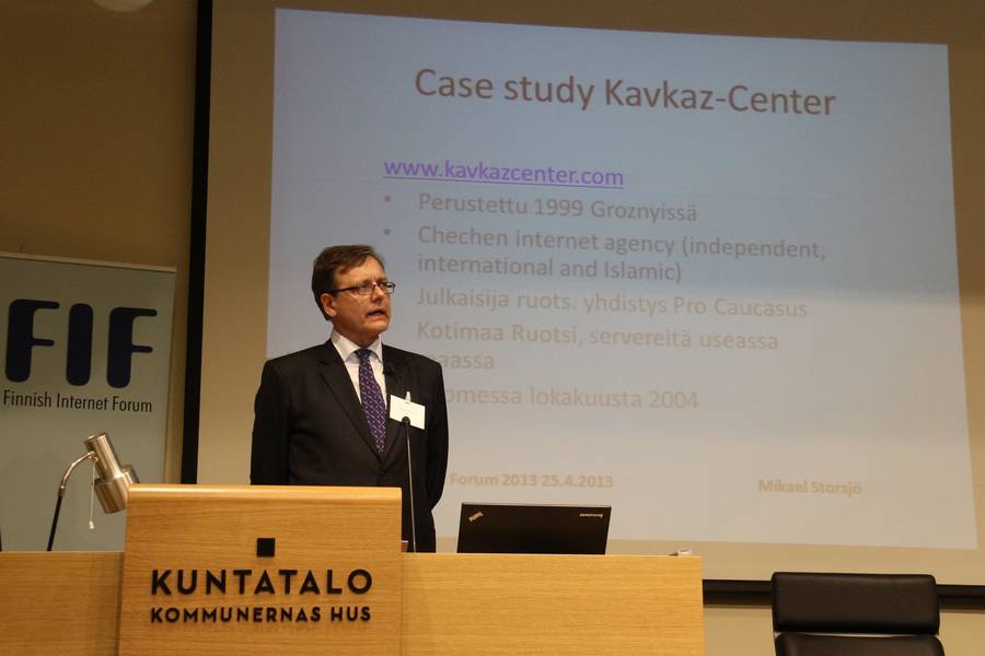 Доклад Микаэла Стурше под названием "ДДоС-атаки на примере Кавказ-Центра" (Palvelunestohyökkäyksen torjuminen - case study Kavkaz-Center) был прочитан на утренней сессии Форума-2013 и начался в 10.30.