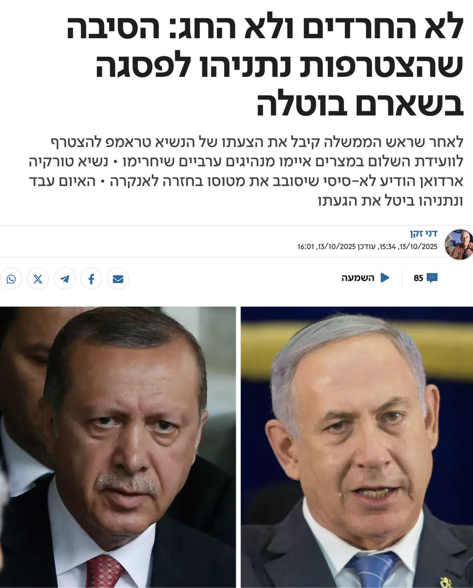 Нетаньяху отменил свою поездку на саммит в Шарм-эш-Шейхе не из-за «праздника или давления ультраортодоксов», а из-за возражений президента Турции Эрдогана, утверждает еврейское издание «Исраэль Хайом».
