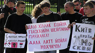 Участники Антиимперского Марша несли лозунги и транспаранты на украинском и чеченском языках: «Киев против Москвы!», «Свобода народам, свобода человеку», «Да здравствует Докка Умаров - Амир мусульман!», «Смерть палачам и предателям», «Да уничтожит Аллах сатанинское русское государство и сохранит Чечню!», «Русский оккупант, вон из Чечни», «Россия - гнездо расизма и враг африканцев», «Сегодня Чечня, завтра Украина!», «Мусульмане Индии и Пакистана вместе с Чечней и Украиной - против России», «Путина к ответу», «Нет оккупации Кавказа», «Моджахеды всех стран объединяйтесь» и др.