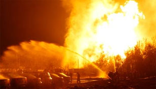 В 6:30 утра по местному времени ситуация вновь осложнилась - на месте диверсии произошел еще один выброс пылающего газа. Вызван он был выбросом остатков газа, возникшем после перекрытия ветки. Резко усилилось пламя, пожарные были вынуждены отойти назад.