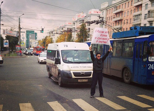Вечером один из местных мусульман вышел на одиночный пикет на проезжую часть в центре Челябинска с плакатом - "В России запрещен Коран 17 сентября 2013 года. Я против!" (фото).