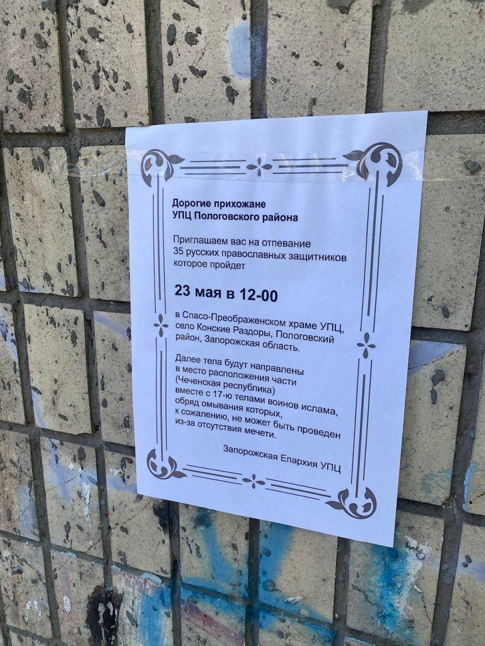 Не менее 17 трупов кадыровцев вместе с 35 русскими кафирами, убитых в ходе боевых действий в Запорожской области, отпевали в оккупированном селе Конские Раздоры Пологовского района. Процедуру отпевания муртадов провели священники УПЦ (МП).