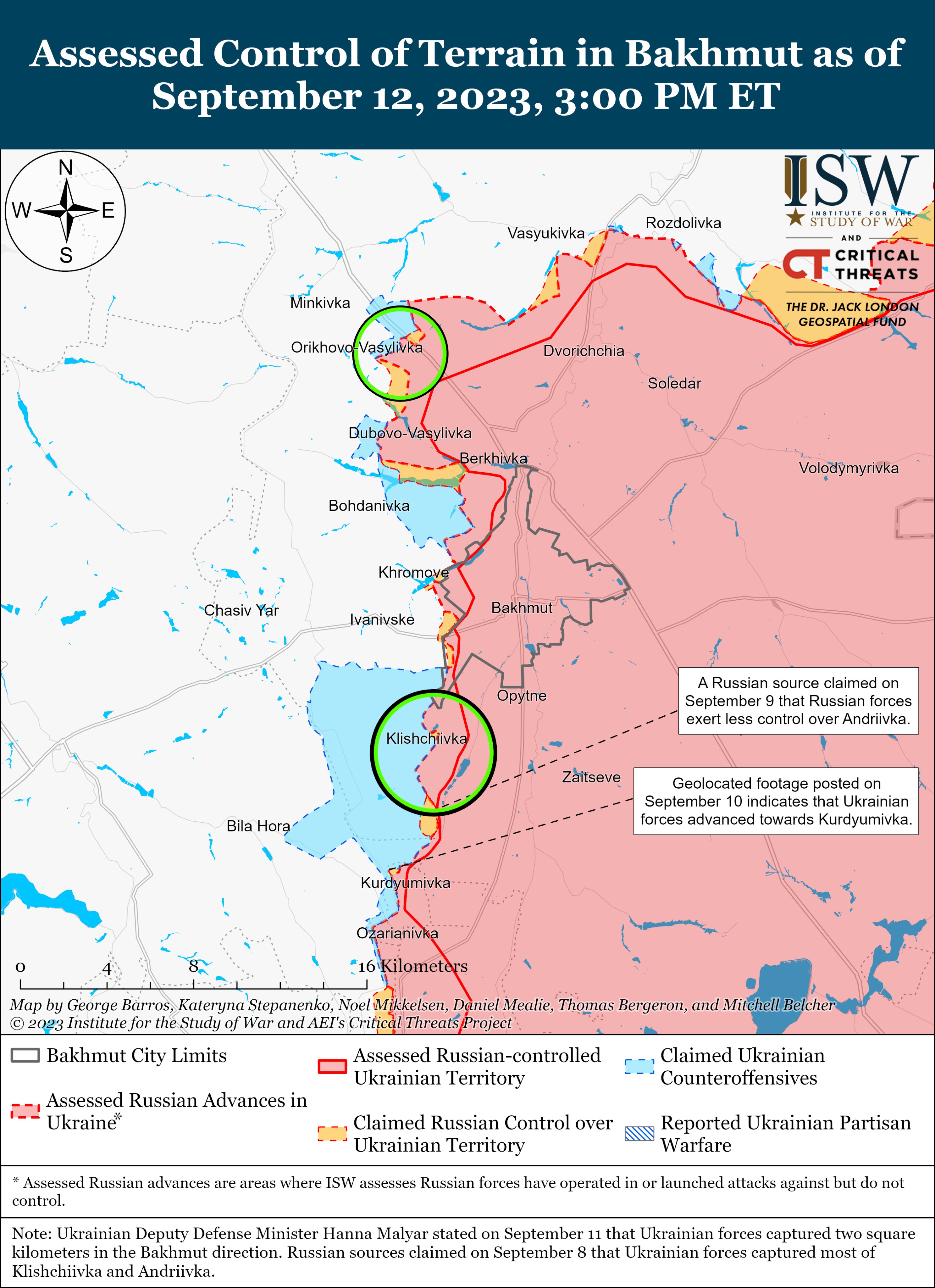 Кадры с геолокацией от 11 и 12 сентября показали успехи ВСУ к северу от Курдюмовки и юго-западу от Майорска. В Генштабе Украины заявили, что ВСУ продолжают контрнаступление и имеют успехи на юге от Бахмута.