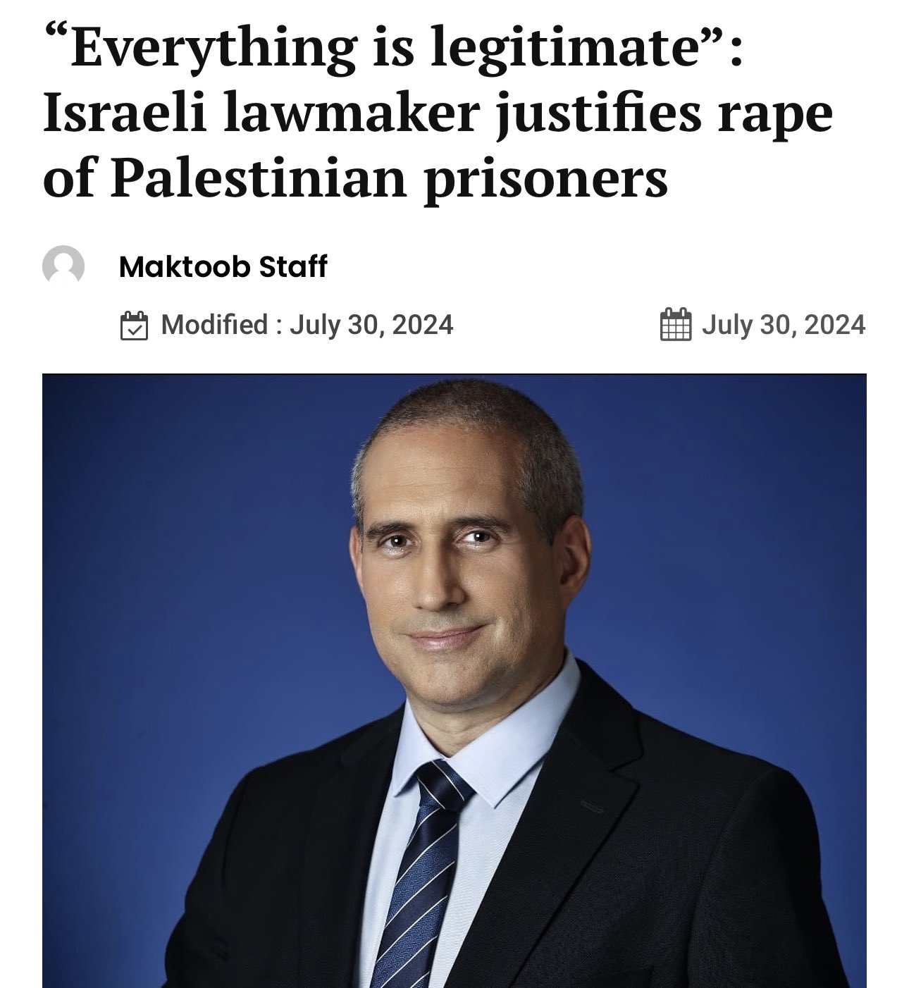 Еврейские политические деятели на официальном уровне в публичной форме оправдывают изнасилования палестинских заложников тем, что по еврейским законам изнасилования законны, т.к. жертвы неевреи.